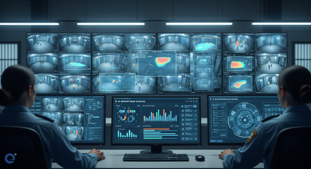 Màn hình giám sát nhà tù hiển thị các cảnh quay từ camera AI, với các phân tích hành vi và cảnh báo tự động.