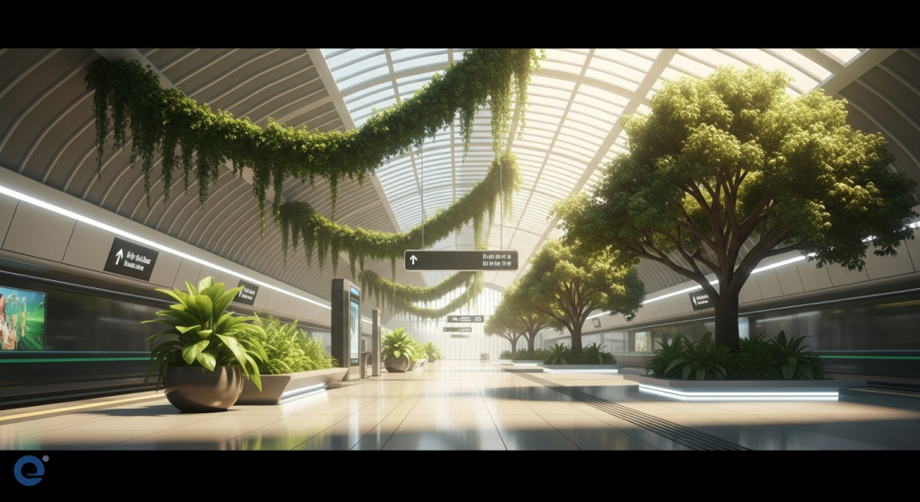 Mặt khác, yếu tố sinh thái mang đến sự gần gũi, thư thái. Nó giúp con người cảm thấy kết nối với thiên nhiên ngay cả khi đang ở dưới lòng đất. Việc tích hợp cây xanh vào thiết kế là điều cốt lõi. Các bức tường xanh, vườn treo, hoặc thậm chí là các khu vườn nhỏ có thể được bố trí khắp ga.