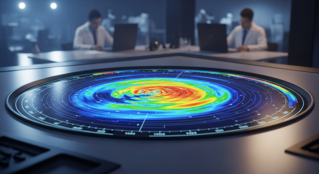 Màn hình radar thời tiết hiển thị dữ liệu phức tạp, sẵn sàng cho phân tích AI.