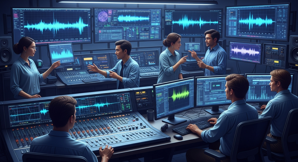 Hình ảnh minh họa các kỹ sư đang làm việc với dữ liệu âm thanh đa dạng để huấn luyện mô hình AI nhận diện giọng miền.