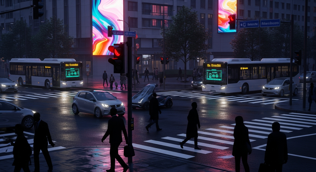 Hình ảnh một giao lộ đô thị nhộn nhịp với các phương tiện giao thông công cộng, xe cá nhân và người đi bộ, tất cả đều được điều phối bởi các tín hiệu đèn giao thông thông minh và màn hình hiển thị thông tin kỹ thuật số.