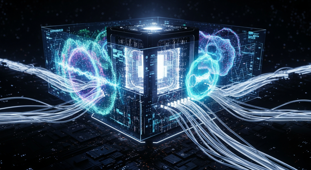 Hình ảnh minh họa một siêu máy tính đang xử lý lượng dữ liệu khổng lồ, với các biểu đồ và hình ảnh trừu tượng bay lượn xung quanh, tượng trưng cho sức mạnh tính toán vượt trội của Trí tuệ Nhân tạo Siêu việt.