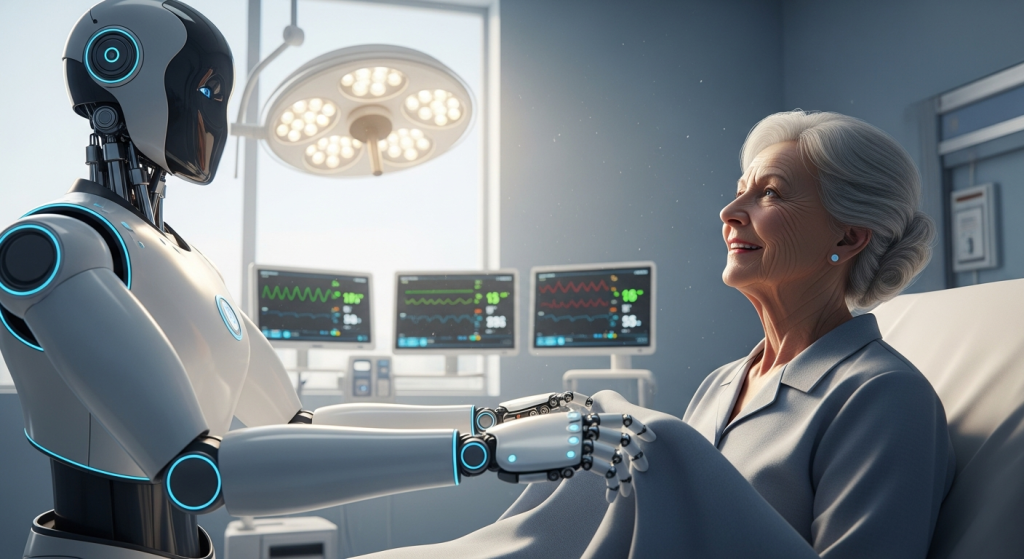 Một robot y tế đang thực hiện nhiệm vụ hỗ trợ bệnh nhân, thể hiện sự kết hợp giữa công nghệ và lòng trắc ẩn.