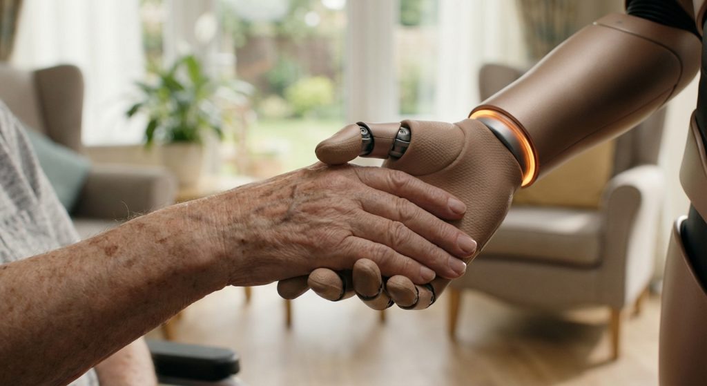 Một robot chăm sóc người già nhẹ nhàng nắm tay một người cao tuổi, thể hiện sự đồng cảm và kết nối.