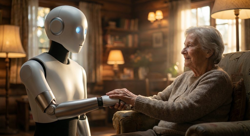 Một robot chăm sóc người già nhẹ nhàng nắm tay một người cao tuổi, thể hiện sự đồng cảm và kết nối.