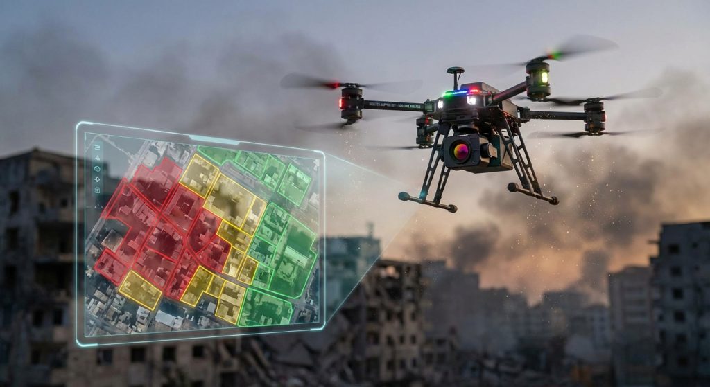 Các bot, thường là drone hoặc robot mặt đất, sử dụng camera và cảm biến để thu thập dữ liệu về khu vực bị ảnh hưởng. Dữ liệu này sau đó được xử lý bằng AI để tạo ra bản đồ chi tiết, hiển thị mức độ thiệt hại, các tuyến đường an toàn và các khu vực nguy hiểm.