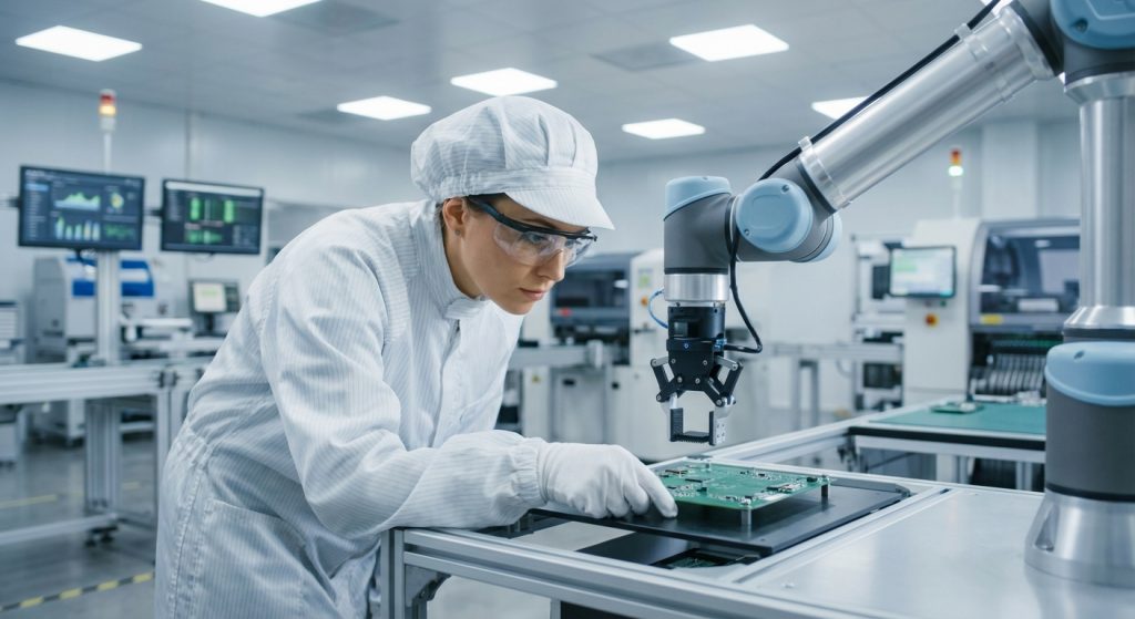 Trong ngành điện tử, robot cộng tác hỗ trợ lắp ráp các linh kiện nhỏ. Chúng có độ chính xác cao. Chúng có thể thực hiện các tác vụ đòi hỏi sự tỉ mỉ. Ví dụ, hàn các mạch điện tử. Hoặc đặt các chip nhỏ lên bo mạch. Điều này đảm bảo chất lượng sản phẩm cao. Nó cũng tăng tốc độ sản xuất.