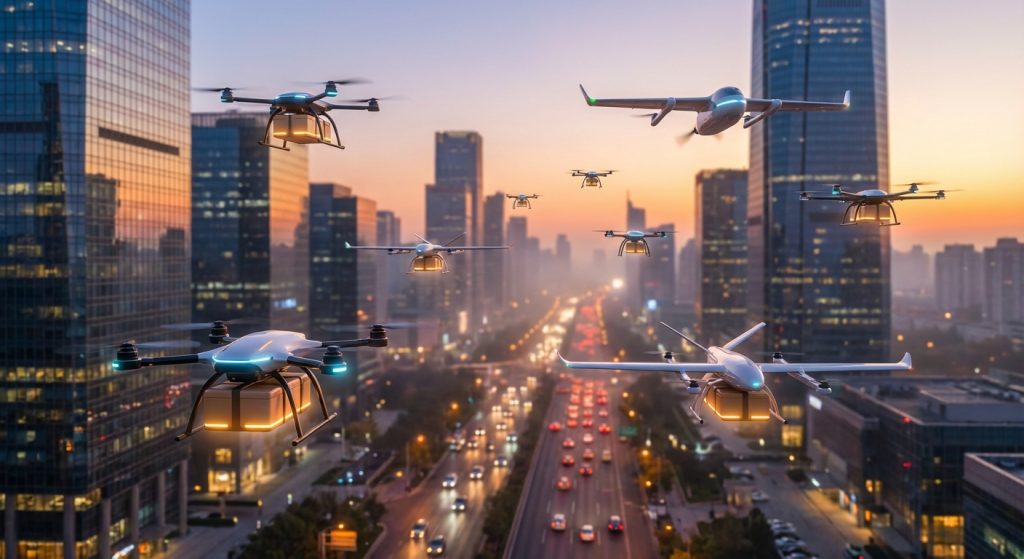 Một bầy drone giao hàng đang đồng bộ cất cánh từ một trung tâm phân phối đô thị vào lúc hoàng hôn.