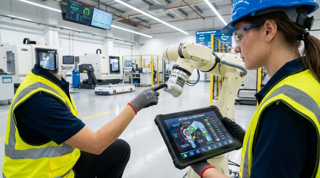 Hơn nữa, chúng ta sẽ khám phá các phương pháp tiếp cận hiện đại, đặc biệt là với robot cộng tác (cobot). Vì vậy, mục tiêu là trang bị cho bạn kiến thức cần thiết để xây dựng một môi trường làm việc không chỉ hiệu quả mà còn an toàn tuyệt đối.