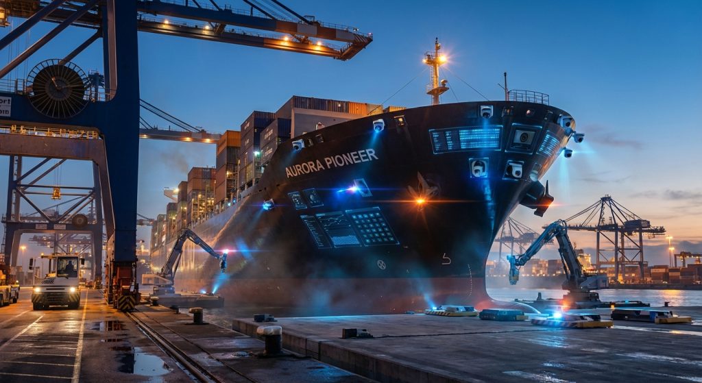 Hình ảnh minh họa: Một con tàu container lớn đang tiến vào bến cảng hiện đại, được dẫn đường bởi các camera và cảm biến tiên tiến.