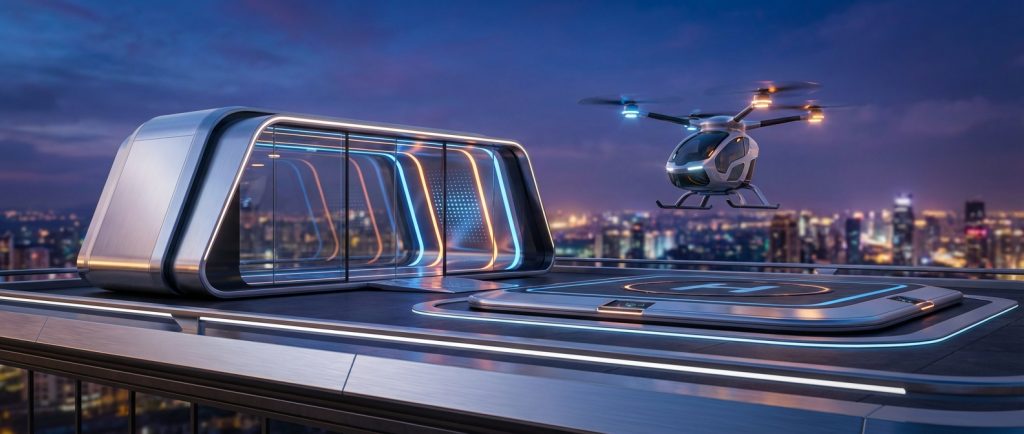 Hình ảnh minh họa một trạm sạc pin drone hiện đại, tự động hóa, sẵn sàng phục vụ các phương tiện bay không người lái.