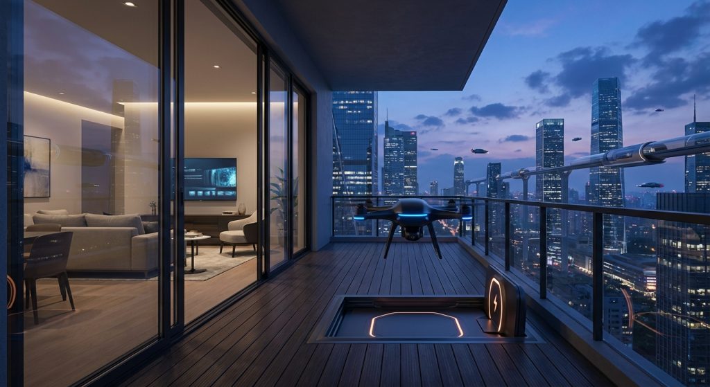 Tưởng tượng một ban công căn hộ được thiết kế đặc biệt cho việc đón/trả khách bằng drone, với hệ thống dẫn đường và an ninh tích hợp.