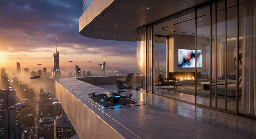 Tưởng tượng một ban công căn hộ được thiết kế đặc biệt cho việc đón/trả khách bằng drone, với hệ thống dẫn đường và an ninh tích hợp.
