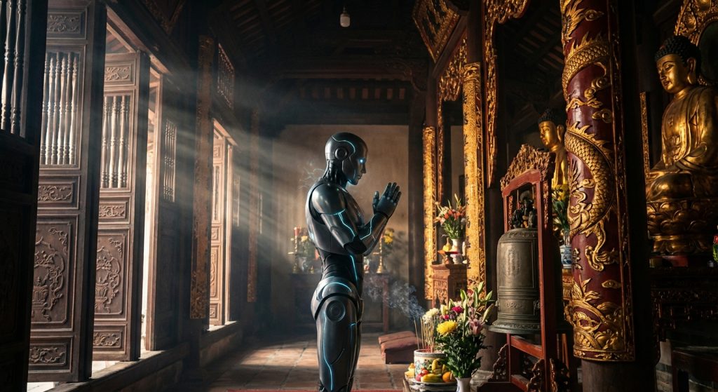 Hình ảnh một robot hình người với dáng vẻ trang nghiêm, đang đứng giữa một ngôi chùa cổ kính, với ánh nắng chiếu qua mái ngói.