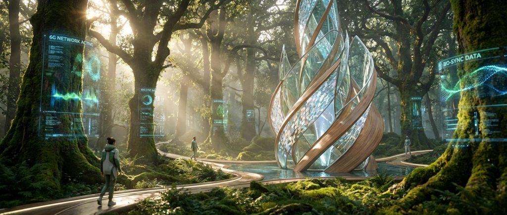 6G cung cấp kết nối siêu tốc độ, độ trễ cực thấp, và khả năng kết nối hàng tỷ thiết bị IoT. Điều này cho phép các chức năng như VR/AR, làm việc từ xa, và quản lý thông minh hoạt động mượt mà, hiệu quả trong công viên số.