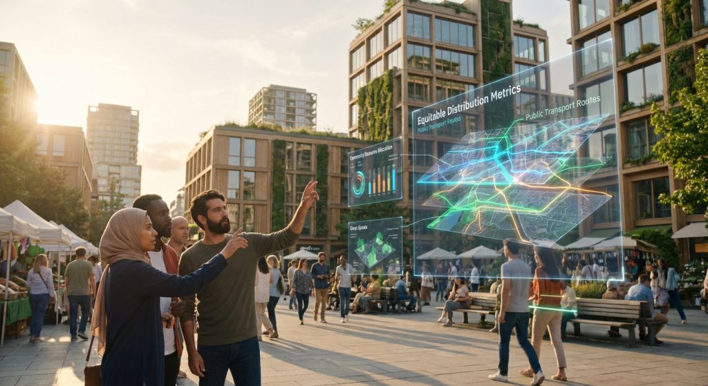 Hình ảnh minh họa cho thấy một giao diện điều khiển thành phố thông minh, nơi các chỉ số dữ liệu được hiển thị trực quan và có thể được điều chỉnh bởi AI để đảm bảo sự công bằng cho mọi khu vực dân cư.