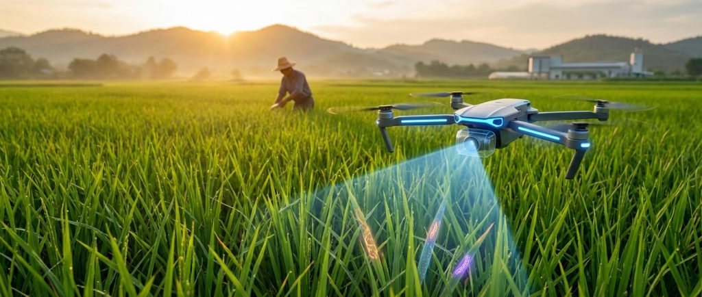 Một cánh đồng lúa xanh mướt, nơi những chiếc drone nhỏ đang bay lượn, chụp ảnh cây lúa để phát hiện sâu bệnh.